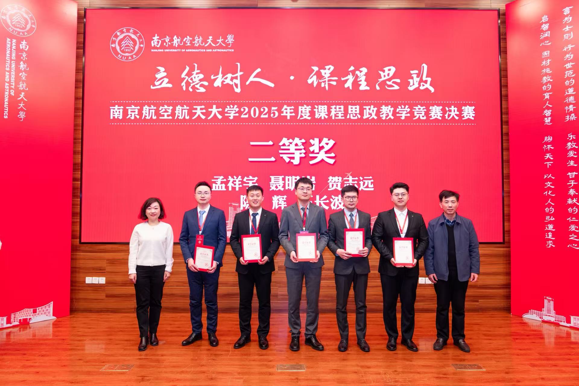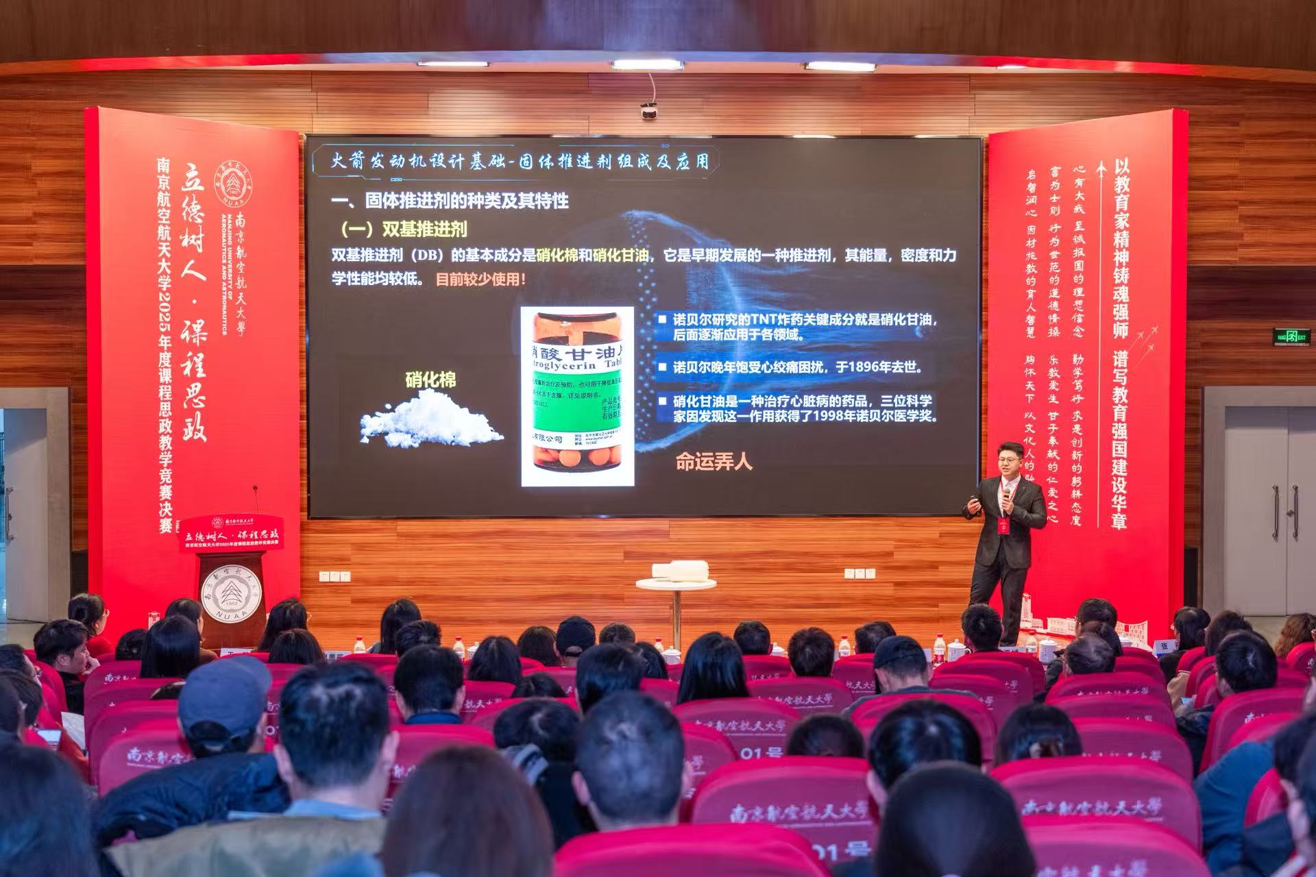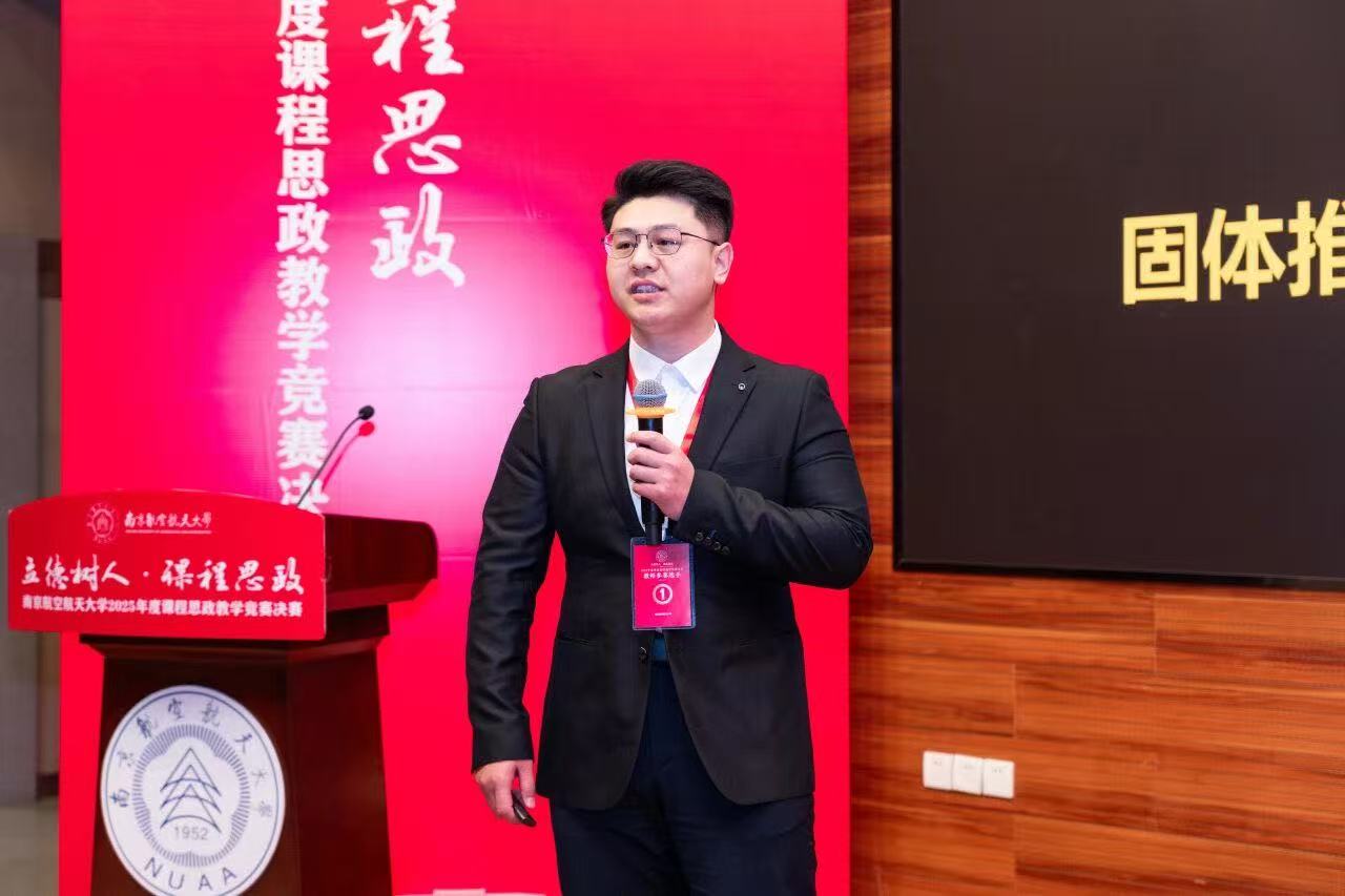本次竞赛由教务部牵头,宣传部、人资部/教师工作部等单位协同举办,是我校持续深化教育教学改革、落实立德树人根本任务的重要品牌活动,迄今已成功举办八届。决赛紧扣“突出国防底色、强化工信特色、彰显南航特质”三大篇章展开。孟祥宇老师以课程《炼丹意外?国防基石!——固体推进剂组成及应用》参赛,从我国古代四大发明之一的黑火药引入,融入以“大国工匠”徐立平为代表人物事迹,讲述固体推进剂的发展历程。课程通过展现前沿技术挑战,激发学生的探索热情与创新意识,凝聚以报国志向与时代担当为核心的奋进动力。孟老师凭借扎实的专业功底与富有创意的教学设计,赢得了评委及现场师生的高度评价。